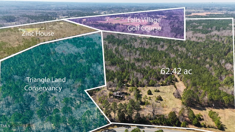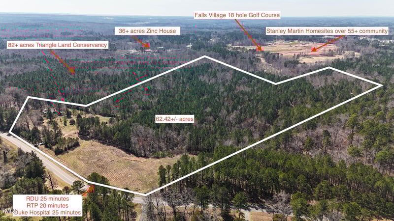 Listing details for Southview Rd, Durham, NC 27703 : 62+ Acres - Prime Land Opportunity in Durham! This is the largest tract of land currently available in Durham, offering 62+ acres of prime real estate. The property backs up to Zinc House, a renowned winery and brewery set on 37+ acres, and is adjacent to Falls Village Golf Course, an established 18-hole course. Conveniently located 11 miles from Research Triangle Park (RTP) 13 miles from Raleigh-Durham International Airport (RDU) 14 miles from Crabtree Valley Mall.The parcel is currently in the forestry program and zoned RR (Rural Residential). It is bordered by 83+ acres of Triangle Land Conservancy, ensuring exceptional privacy. Additionally, 23+ acres are available directly across the road, bringing the total potential acreage to 85+ acres. With endless possibilities for development, investment, or private retreat, horse farm, small winery, this is a rare opportunity. Large tracts of land like this are hard to find—act fast!