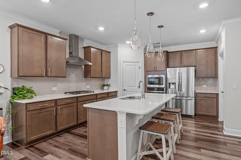 Upstairs is a large guest suite with its own flex/bonus room, ideal for visitors or a private retreat. Thoughtful upgrades include pull-out cabinet drawers, custom closet systems, garage shelving, and crown molding throughout. Refrigerator, washer, and dryer convey.
