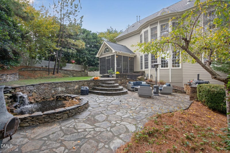 Step outside to your private, storybook backyard, a true sanctuary reminiscent of a romantic French garden. Here, stone paths meander through lush landscaping toward tranquil features including a pond, built-in grill, gas fire pit, playground, and hot tub. Every detail invites relaxation and connection.