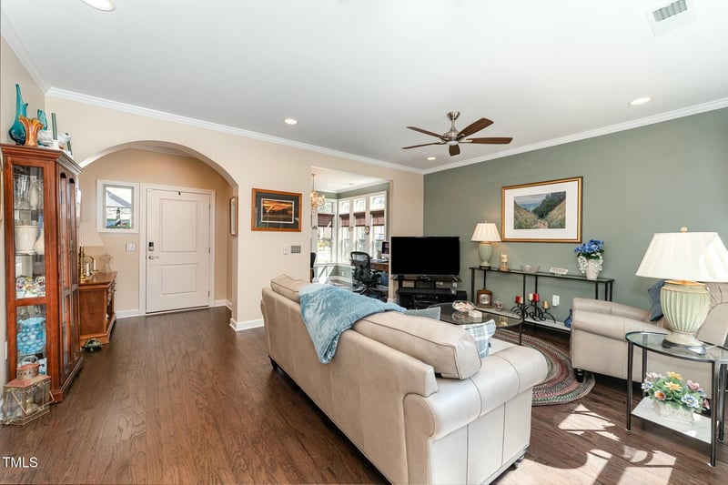 Listing details for 1009 Restoration Dr, Durham, NC 27703 : Nestled in the highly sought-after community of The Courtyards at Andrews Chapel, this meticulously maintained ranch and half home offers a perfect blend of comfort and style. With 3 bedrooms and 3 baths, this charming home is designed for both relaxed living and seamless entertaining. Upon arrival, you are greeted by a welcoming covered front porch with beautiful stone accents. Inside, the open-concept floor plan effortlessly combines a spacious living room and versatile office area, filled with abundant natural light from large windows and complemented by elegant, engineered hardwood floors. Arched hallways enhance the home's architectural appeal, contributing to the airy, open feel that flows effortlessly throughout. The chef-inspired kitchen is a true highlight, featuring sleek stainless-steel appliances, granite countertops, a gas stove, double oven, a center island, and an abundance of cabinetry for all your culinary needs. Whether preparing a meal or hosting friends, this kitchen is sure to impress. The expansive primary suite, conveniently located on the first floor, offers access to the screened-in porch and patio, providing a peaceful retreat. Enjoy the convenience of a large walk-in closet, dual vanities, and a luxurious zero-entry, tiled shower that creates a spa-like experience. For added convenience, the oversized laundry room comes with a utility sink and generous built-in cabinetry for extra storage. Upstairs, discover a massive bonus room with a full bathroom, offering endless possibilities for a media room, guest suite, or home gym. Step outside to the private, beautifully landscaped patio, enclosed within a fenced backyard—an ideal setting for entertaining or simply relaxing in your own personal oasis. Community amenities include a clubhouse, fitness center, and a sparkling pool, making it easy to stay active and social. With easy access to I-540 and I-40, this home's location is both convenient and desirable. Don't miss the opportunity to make this exceptional home your own—schedule a tour today!