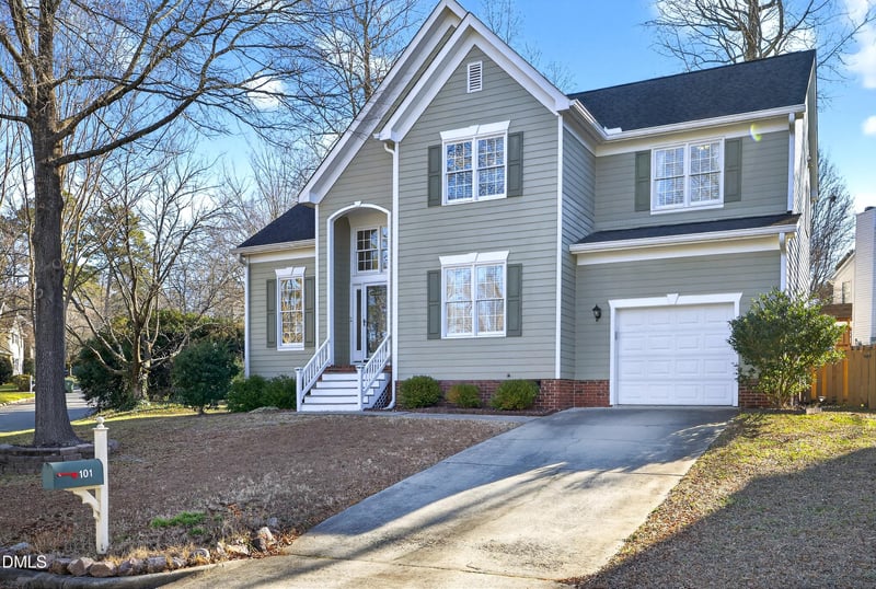 Listing details for 101 Cherry Grove Dr, Cary, NC 27519 : This beautifully maintained and updated, light-filled home in a prime Cary location is close to highly desirable schools. Relax and unwind in the spacious sunroom overlooking the private, fenced backyard with a huge wrap around deck and playground. This home will delight with an open floor plan, high ceilings, beautiful LVP floors and many windows which bring in lots of natural light. The gourmet eat-in kitchen is a chef's dream with Quartz countertops, tons of beautiful cabinets, accent lighting, and stainless steel appliances. Cozy up and watch movies on the large home theater screen. The home office features beautiful custom built-in shelving. The large Master bedroom and bath are perfect for unwinding with vaulted ceilings, walk-in closet, dual vanities, tub and separate shower. There are two additional large bedrooms upstairs and a full bath. Enjoy Smart home features including EV charger, Nest Learning thermostat and Simplisafe doorbell. Amazing location with Top Rated Schools and close proximity to shopping, restaurants, parks, RTP, and RDU! Amenities include the pool, walking trails and large playground. Recent Upgrades: Custom built-ins in office (2025), Level 2 electrical charging station (2025), HVAC (2024), LVP flooring throughout the main level (2021), Master shower (2021), Whole house plumbing (2020).