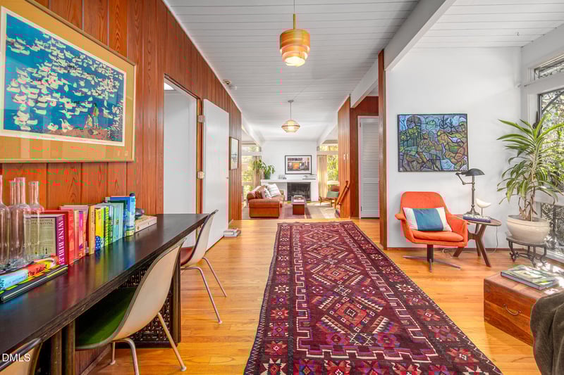 Listing details for 1030 Highland Woods Rd, Chapel Hill, NC 27517 : You know that sweet feeling in the pit of your stomach when you've found the one and only? Step into 1030 Highland Woods Road and you'll see what I mean. This house has the unmistakable gravity of deep magic and wisdom in its bones. On the NC Modernist registry, Highland Woods is a rare Webb house with only three owners. Its idyllic location, nestled in woods laced with botanical varieties and wildlife, as well as its inherent architectural beauty offer a feast for the eyes and rest for the soul. The home's thoughtful design includes a large kitchen with plenty of space to entertain, a generous owner's suite on the main floor with a renovated bathroom, a Mad Men-cool living room and foyer with original paneling, and three more bedrooms (with clerestory windows!!) and another renovated bath on the main. Downstairs opens up a world of possibilities, with the most comfortable second living space possible for your extra family, that snarky teen, for your own getaway, or as a chance to earn extra income, as you've got another bedroom, full kitchen, living room, extra storage space, and full bath, drenched in natural light. Enjoy the view of your garden or trellis with mature grape vines from any one of the back porches - you won't see another house. Location wise, it's hard to get any better when you're minutes from UNC, the Botanical Trails, Finley Fields, and about 15 minutes from Duke. Newer HVAC, water heater, new ROOF resurface, and fresh paint. Be sure to check out the home details document which will share how loved and well-maintained this home has been.