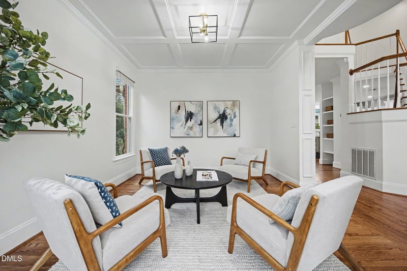 Inside you'll find refinished hardwood floors, fresh paint throughout, and abundant natural light. The thoughtfully designed layout includes a desirable main-floor guest suite, perfect for visitors or multi-generational living. A private office with a charming Juliette balcony overlooking the grand entry, creates a striking architectural focal point. The renovated kitchen is the heart of the home and flows seamlessly into inviting living spaces, including a sitting room with a picture window that frames serene outdoor views.