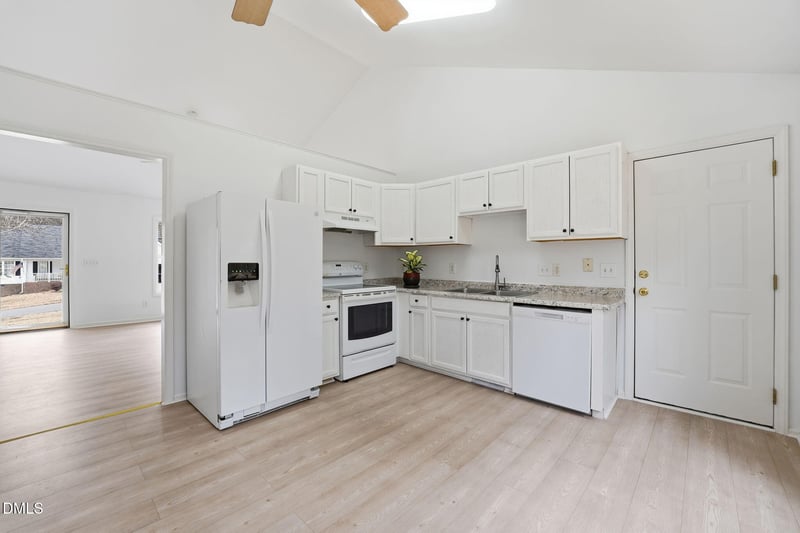 Listing details for 104 Margaret Dr, Creedmoor, NC 27522 : Tucked along a quiet cul-de-sac just a short walk from Lake Rogers Park, this refreshed 3-bedroom, 2-bath ranch sits on a 0.27-acre lot. Vaulted ceilings and natural light give the main living area an open, comfortable feel from the moment you enter. New flooring and fresh interior paint carry throughout the home, and the kitchen has been updated with refreshed cabinetry. The dining area opens directly to the rear deck, making it easy to step outside for dinner or a quiet evening at home. The primary suite includes a walk-in closet and dual-sink vanity, while two additional bedrooms offer room to adapt as needs change.