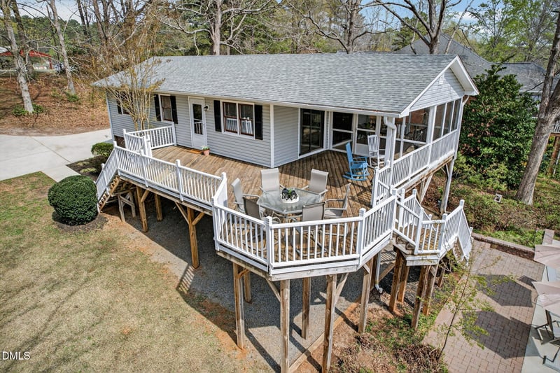 Listing details for 104 Pontiac Cv, Louisburg, NC 27549 : Experience breathtaking views of Lake Royale from this exceptional waterfront retreat. Set on .97 acres this property offers panoramic water views and an effortless connection between indoor and outdoor spaces. Take in stunning sunrises from the screened porch & expansive deck or gather w/ friends on the impressive stone paver patio, complete with built-in horseshoe area. Enjoy direct lake access from the double boathouse w/ boat lift, plus a large dock perfect for boating, swimming, fishing & soaking up the sun. Inside, the cozy open floor plan is designed to maximize natural light and showcase stunning lake views from the main living areas. Recent updates include fresh interior paint, updated light fixtures & new architectural shingle roof (2025). Additional features include a 4-zone irrigation system with lake-fed pump, storage room & 2nd full bath conveniently located at the rear of the home. Located in the gated resort community of Lake Royale, residents enjoy access to exceptional amenities including two free golf memberships, clubhouse, multiple beaches, a swimming pool, tennis courts, pickleball, volleyball, mini golf, playgrounds, year-round boating, and restaurant overlooking the golf course.