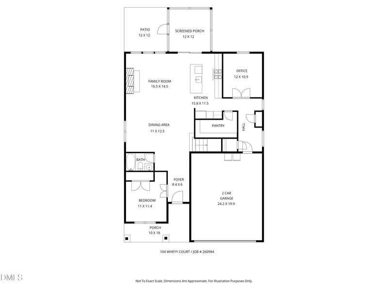 Listing details for 104 Whey Ct, Wake Forest, NC 27587 : Nearly new Drees home on one of the largest cul-de-sac lots in Meadow at Jones Dairy, featuring a spacious fenced backyard and screened porch perfect for relaxing or entertaining outdoors. The first floor features a bright open layout with wide foyer entry, dining area, and versatile first-floor bedroom or office with Murphy bed. Chef's kitchen includes a gas cooktop, built-in wall oven and convection microwave, subway tile backsplash, white cabinetry, Energy Star appliances, and an oversized pantry. The large family room features a gas fireplace. A private study and multiple hall closets provide flexible living space and generous storage. Upstairs, a spacious loft provides additional living space. The primary suite includes a luxurious spa-style bath with soaking tub, walk-in shower, dual vanities, and an oversized walk-in closet. Secondary bedrooms are generously sized, including one with a private ensuite bath. The home also features an unfinished third-floor walk-up attic (622sqft) with excellent expansion potential--finish it for additional living space or keep it as abundant storage. Hardwood flooring runs throughout the main living areas, with carpet in the bedrooms. Neighborhood pool and Greenway close by. Smart lights and fans, prewired for Central Vac and several data ports through out. This gently lived-in home offers better-than-new convenience and is close to downtown Wake Forest and major commuting routes into Raleigh.