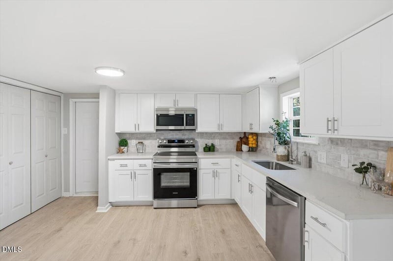 Listing details for 106 Par Cir, Garner, NC 27529 : This beautifully updated ranch home features new engineered wood floors throughout the main living areas and plush new carpet in the bedrooms. The kitchen has been refreshed with new shaker cabinets, quartz countertops, a stylish tile backsplash, and stainless steel appliances. Bathrooms have been updated with new tile floors and custom vanities, completing the home's move-in ready appeal with thoughtful, modern upgrades throughout.