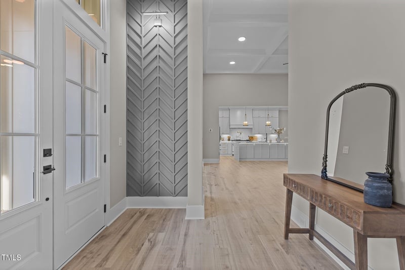 Double front doors open to a dramatic foyer with a coffered ceiling, setting the tone for the 14-foot coffered ceilings in the family and dining rooms, 10-foot ceilings throughout, and 8-foot craftsman doors that make every space feel grand.
