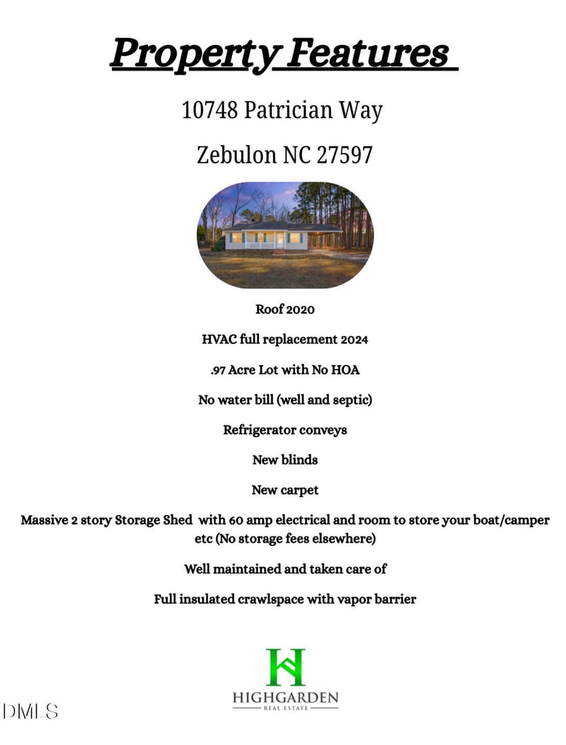 Listing details for 10748 Patrician Way, Zebulon, NC 27597 : Don't knock this till you come see it!!!! This adorable 3 bedroom, 1 bath gem that packs away more punch than you'd expect on a .97 lot! Big ticket updates are already done for you with a 2020 roof and a complete 2024 HVAC replacement so you can move in and relax instead of making repairs!