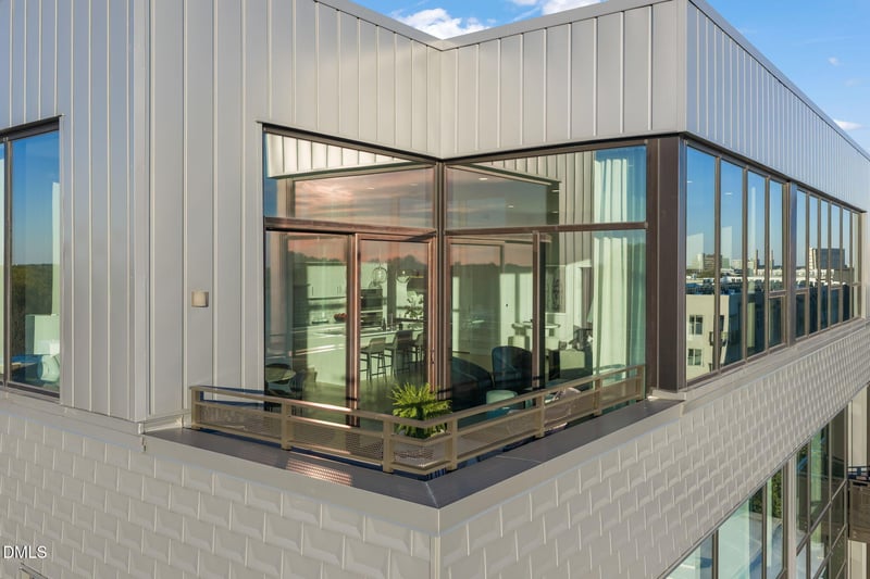 Listing details for 1105 Main St #704 Pent House, Durham, NC 27701 : Penthouse in Downtown Durham with stunning southwest sunset views, offered at an exceptional value and presented with custom designer furniture, gorgeous wall finishes, and convenient motorized blinds that create a seamless move in experience for any savvy buyer. The spacious, well designed kitchen features quartz countertops, stainless steel appliances, and an induction cooktop, all surrounded by expansive windows and soaring ceilings that make this penthouse one not to miss. A large, well designed pantry and walk in laundry room with custom cabinetry provide ample storage for the organized buyer. The built-ins in the primary closet, along with the thoughtful selection of furniture that fits the space perfectly, are a rare find. With a Nest thermostat, an oversized terrace for indoor outdoor living, two deeded covered parking spaces, an outdoor dog wash, and secure bike storage, this home is designed for ease and comfort. Located in close proximity to all of downtown Durham's finest shopping and dining, including Duke's East Campus, this residence is truly a Durham penthouse dream come true.