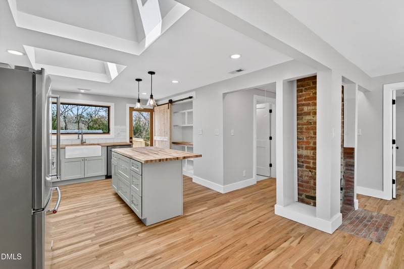 Listing details for 1106 Carroll St, Durham, NC 27707 : Incredible deal for a high-end rebuild. Fully permitted, down-to-the-studs renovation in the heart of Morehead Hill—brand new everything and literally nothing left to do but move in and love it! 1106 Carroll has been rebuilt and reinvented with intention & craft. Roof, windows, siding, HVAC, tankless water heater, electrical, plumbing—plus fresh insulation from top to bottom—set the foundation for truly worry-free living. Beautiful site-finished red oak floors flow through an airy, light-filled layout. The small-but-mighty wood-burning stove anchors the living space with warmth and character. The kitchen is an absolute standout: huge skylights, modern cabinetry, maple countertops, floating open shelves, new appliances, a generous island, and a large pantry. Outside, the large front porch and back deck extend the home's living space, perfect for birdwatching, grilling, gathering with friends and family, or cozying up next to a fire. And the backyard is begging for the garden you've always wanted (or an ADU!). This beautiful home sits high on a quiet, friendly street in Morehead Hill, steps from Lyon Park and Morehead Montessori. Downtown Durham, the West End, the Food Co-op, and Isaac's Bagels are just blocks away. If you've been waiting for a turn-key home with loads of personality and zero compromise, this is it!