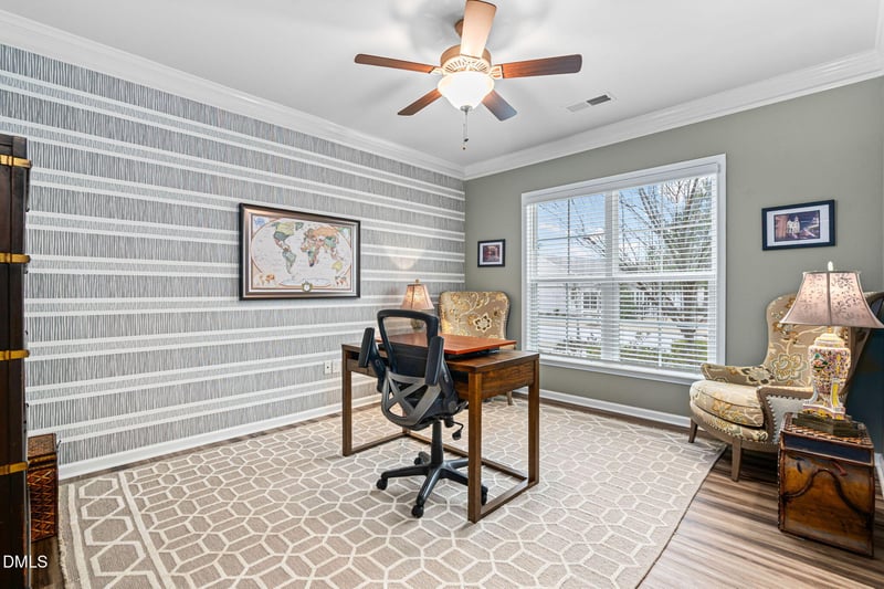 Listing details for 1108 Mendocino St, Wake Forest, NC 27587 : Rarely available, this Sonoma Cove floor plan offers over 2,500 square feet of beautifully designed, single-level living within the 55+ Del Webb at Traditions community. This spacious and thoughtfully laid-out home features 2 bedrooms plus a private office, formal dining room, family room, versatile flex room, and a relaxing screened porch—perfect for both everyday living and entertaining. The gourmet kitchen is the true centerpiece featuring a wall oven, electric cooktop, oversized center island, and a walk-in pantry, all accented by modern finishes ideal for cooking and gathering. Luxury vinyl plank flooring flows throughout the main living areas, paired with custom paint selections and sophisticated designer wall treatments. Every detail of this home has been thoughtfully upgraded. The private secondary bedroom includes a full bath and a custom Murphy bed, offering exceptional flexibility for guests or multi-purpose use. The oversized garage provides generous space for storage or a workshop. Residents enjoy access to outstanding community amenities, including a clubhouse, fitness center, indoor pool, walking trails, pickleball courts, and a wide variety of clubs and activities.
