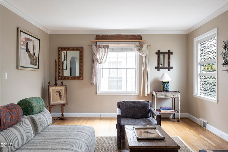 Listing details for 111 Markham Ave, Durham, NC 27701 : Time stands still here... Storybook charm and an unmistakable sense of romance define this stunning 1940 Tudor tucked in the tree-lined streets of Durham's beloved Duke Park neighborhood. With its hand lime-washed exterior and timeless architecture, the home feels almost ethereal -- as if lifted from another era -- yet offers the walkable lifestyle that makes this area so coveted. Inside, historic character presents itself through graceful arches, rich hardwood floors, and beautifully preserved period details that lend warmth and timelessness to every room. Upstairs, a bright and spacious converted attic gives you the choice of creating a dreamy owners retreat with it's en suite bath, or carving out a peaceful space to create. The romanticism follows you to the outdoors as you sip your morning coffee on the screened-in porch featuring antique stained glass as birdsong fills the air. Retreat to the back deck to perch yourself among the trees. The lovingly designed yard features mature landscaping and a hand-built vegetable garden ripe for your next harvest. Nature and community surround you here. The Ellerbee Creek Trail, Durham Farmers' Market, and the open green spaces of Duke Park are all just a short walk away. Enjoy the gentle sounds of frogs in the evening, neighborhood strolls beneath a leafy canopy, and quick access to downtown dining, arts, and highway connections when you need to venture farther. Romantic, timeless, and deeply rooted in place, this Duke Park Tudor offers a rare blend of historic beauty, natural serenity, and urban vibrancy.