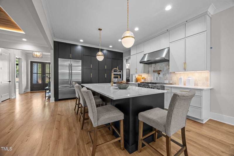 Listing details for 1112 Delilia Ln, Wake Forest, NC 27587 : 2025 PARADE OF HOMES ENTRY! Custom Built by Award Winning Brandywine Homes. Large Private Wooded Lot in a Serene Pond Community! Elevated Features Including Marvin Fiberglass Essential Line Casement Windows w/Premier Cardinal Glass, Elegant Finishes & Upgraded Trim! Main Level Primary Suite, Guest Suite, Private Study & 3 Car Garage! Wide Plank Hardwoods throughout Main Living. Kitchen: Custom Two Toned Painted Cabinetry to Ceiling, Large Quartz Island w/Barstool Seating, Designer Pendant Lights, Accent Tile Backsplash, JennAir Gourmet Appliance Package Incl 6-Burner Gas Range & French Door Refrigerator & Hidden Walk in Pantry! Opens to Huge Informal Dining with Tons of Natural Light! Spacious Primary Suite: features Hardwoods, Stained Wood Beam Ceiling & Painted Trim Detail Wall! Primary Bath: offers Oversized Dual Vanity with Quartz Top & Designer Sconces, Stacked Center Vanity Tower, Zero Entry Spa Style Shower w/Freestanding Tub & Huge Walk in Closet with Direct Laundry Access! Family Room: Custom Surround Fireplace w/Flanking Built ins & Large Slider Doors to the Vaulted Screened Porch with Stone to Ceiling Surround Fireplace! Upstairs Recreational Room w/Wet Bar & Built-ins, Two Walk in Storage Areas & Two Additional Secondary Bedrooms!