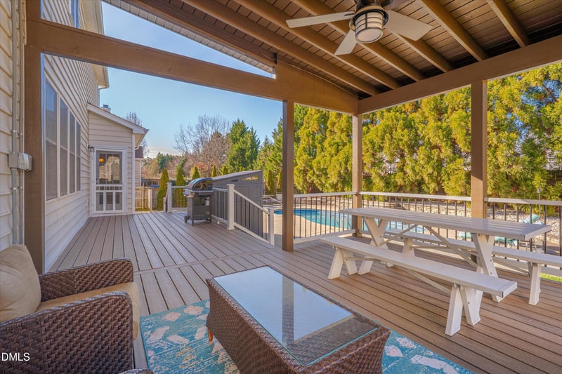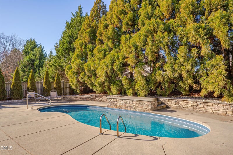Listing details for 112 Beckford Rd, Cary, NC 27518 : Located in Cary's Cotswold neighborhood, this brick-front home stands out for its private in-ground saltwater pool, set within a fenced backyard surrounded by mature trees, creating a private outdoor retreat! Inside, the functional layout centers around a spacious kitchen with granite countertops, under-cabinet lighting, generous storage, and an oversized island with prep sink that connects seamlessly to the outdoor space. The main level includes a guest bedroom next to a full bath, a living room with gas log fireplace, built-ins, and home theatre with in-wall speakers, a flexible office or sitting area, a formal dining room, and hardwood floors. Upstairs, the primary suite features a garden tub, walk-in tiled shower, private water closet, and two walk-in closets. Additional bedrooms, a bonus room, and a laundry room with utility sink and storage complete the second floor. New carpet was added in 2026 on the second floor and staircase. Outdoor features include extended concrete decking, an added Trex deck, and a roofed section that creates comfortable spaces for relaxing or hosting. Additional highlights include a sealed crawlspace with dehumidifier, smart thermostats, and unfinished attic storage. Convenient access to major highways, shopping, dining, and everything Cary has to offer.