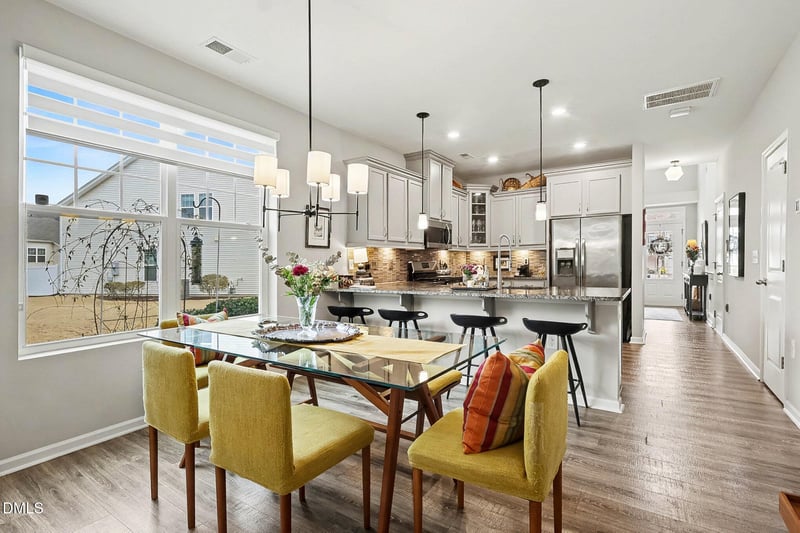 Listing details for 114 Turnip Patch Way, Hillsborough, NC 27278 : Beautiful end-unit townhome with green space and peaceful views! This upgraded home features a primary suite on the main level, a fenced backyard, and a screened porch with ceiling fan—perfect for relaxing or entertaining. Enjoy the light-filled two-story great room with gas fireplace, enhanced by stylish light fixtures and custom shades. Kitchen that shines with granite countertops, stainless steel appliances & glassed-front cabinets. Ideal for everyday living, upstairs loft space and jack and jill bathroom. Move-in-ready home in a desirable Hillsborough location with walking trails, a playground and pool. Enjoy every part of your new community!