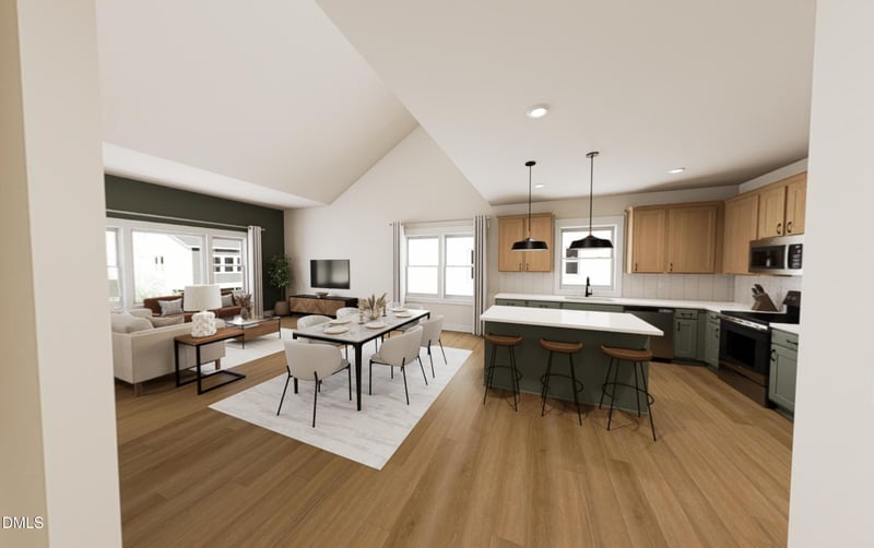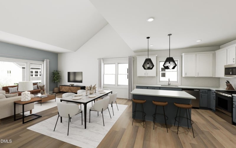 This brand-new 4-bed, 3.5-bath townhome features an open-concept with a second floor designer kitchen, walk-in pantry, and light-filled living areas that flow effortlessly. Vaulted ceiling in family room The main bedroom is tucked away as its own little oasis.