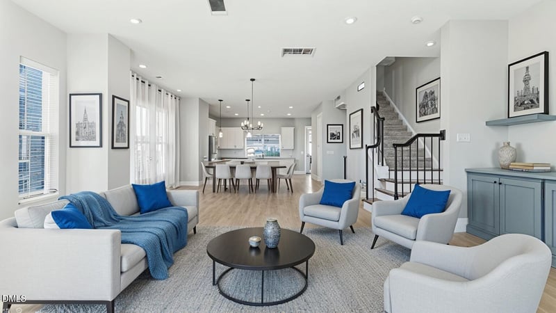 Listing details for 1179 Cottonsprings Dr, Wendell, NC 27591 : Built by Homes by Dickerson, this like-new end-unit townhome offers superior craftsmanship and modern design. Soaring windows and 10-foot ceilings fill the open layout with natural light, complemented by custom built-ins and a spacious kitchen with granite countertops. The third-floor primary suite features two walk-in closets and a spa-like bath with dual sinks and an oversized shower. A second bedroom upstairs has its own bath, while the first floor includes a private bedroom or office with full bath. Enjoy a two-car garage, driveway, and deck overlooking green space.Steps from Treelight Square dining, coffee shops, Publix, and miles of scenic trails. Community amenities include pools, fitness center, café, and year-round events. Just 20 minutes to downtown Raleigh and eight minutes to Wendell.Photos with furniture are AI generated to show potential.