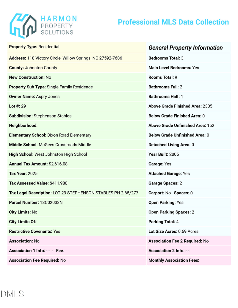 Listing details for 118 Victory Cir, Willow Springs, NC 27592 : This gorgeos meticulously maintained home is in an idyllic setting backing up to a farm, pond and stables. Landscaped flower beds and vegetable garden with irrigation in the yard. Solar panels to minimize energy bills. Three bedrooms on main level. Second floor could be used as a separate living area or bonus rooms, two with a half bath. Large rear covered porch, very large deck, storage building, 2 car garage, much much more...