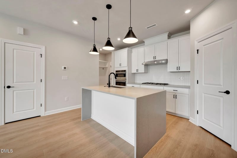 Inside, the main level is bright, open, and functional, with natural light throughout and a layout that flows effortlessly for everyday living. The kitchen is the true centerpiece, featuring white cabinetry, quartz countertops, a statement waterfall island, gas cooktop, double wall ovens, and modern lighting that brings both style and practicality together.