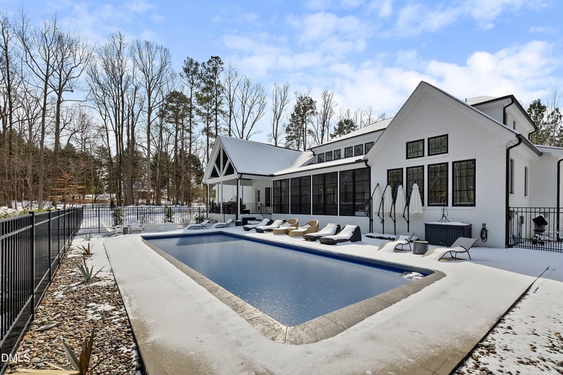 Listing details for 120 Motorcycle Rd, Clayton, NC 27527 : A stunning blend of classic architectural symmetry and refined modern design, this breathtaking private estate is the definition of understated luxury. Privately set on nearly 4.5 acres and surrounded by mature hardwoods, the home offers a rare sense of elegance, scale, and seclusion while remaining conveniently located near the Flowers Plantation area of Clayton, with no HOA restrictions or fees. Offering nearly 4,900 above-ground square feet of heated living space, the residence has been thoughtfully designed for both grand entertaining and everyday comfort. The awe-inspiring two-story living room anchors the main level, showcasing a dramatic floor-to-ceiling shiplap fireplace and coffered ceiling, and opens seamlessly into the kitchen, dining area, and a beautifully appointed library with custom built-ins. Accordion-style glass doors extend the living space outdoors, leading to nearly 500 additional square feet of year-round enclosed entertaining space. The heart of the home is the chef-inspired kitchen, highlighted by a cathedral beamed ceiling extending through the expansive dining area. Floor-to-ceiling white cabinetry with glass uppers, gold-accented hardware, and white waterfall quartz countertops create a bright, elegant statement. The kitchen is complete with a stainless apron-front sink, oversized island, dual ovens, gas range with chef-style vented hood, cabinet-style microwave, built-in dual refrigerator, a hidden oversized walk-in pantry (approx. 5.75' x 14.7'), and a separate butler's pantry—perfect for hosting with ease. The primary wing is thoughtfully tucked away down a private hallway, offering an easily blocked-off entrance for added privacy. The luxurious primary suite features a cathedral ceiling and an abundance of windows overlooking the peaceful grounds. The spa-like bath boasts an oversized zero-entry dual rain-head shower with two access points, a large dual-sink vanity with extensive cabinetry, a custom walk-in closet, a private water closet, and direct private entry into the laundry room. Outdoor living is equally breathtaking. The backyard oasis includes a large in-ground saltwater pool, an oversized covered patio with built-in outdoor kitchen, and a separate fenced area ideal for pets or play. The 31' x 16' enclosed porch, complete with vinyl windows, fireplace, and spa, is easily accessed through accordion-style glass doors off the living room. An open black-rail staircase rises from the living room to the upper level, where you'll find three additional bedrooms and two full baths, including a Jack-and-Jill bathroom shared by two of the bedrooms. Creating a functional and well-designed second-floor layout, you'll also find a loft with built-ins ideal for reading or quiet retreat. Additional highlights include a flex space ideal for a main-floor guest or in-law suite with en-suite bath and walk-in closet, a dedicated first-floor office with extensive built-ins, a recently finished and permitted bonus space with full bath above the garage, an oversized laundry room with abundant cabinetry and a second-floor laundry chute, a third-floor walk-up unfinished attic, generous storage throughout, a built-in pet nook under the stairs, a large mud bench, and a conveniently located half bath near the pool—perfect for outdoor living. If luxury, privacy, and everyday convenience are what you're seeking, this elegant estate checks every box—offering a stunning setting, refined design, and a lifestyle that is truly extraordinary.
