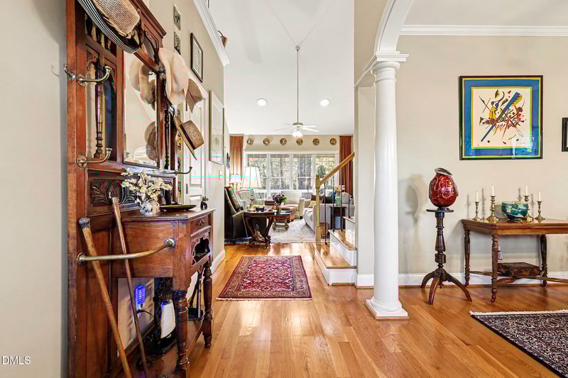Listing details for 1212 Sky Hill Pl, Wake Forest, NC 27587 : Nestled in the desirable Heritage golf community of Wake Forest, this beautiful home offers peaceful fairway views and easy living with landscape maintenance and exterior painting included in the HOA dues. A spacious front porch welcomes you inside, where elegant details and thoughtful design shine throughout. The main level features a first-floor primary suite, hardwood floors in the main living areas, and arched doorways that add architectural charm. The large family room is filled with natural light thanks to solar tubes, and showcases a vaulted ceiling, built-in bookshelves, and a gas log fireplace, creating a warm and inviting space for everyday living or entertaining open to both kitchen and breakfast areas. A gracious dining room flows seamlessly into the kitchen and breakfast area, which overlooks the backyard and golf course views. The kitchen is well-appointed with cherry cabinets, granite countertops, tile backsplash, stainless steel appliances, a gas range, and a convenient built-in desk. The breakfast area is perfectly positioned to enjoy morning coffee with a view. The primary bedroom features a tray ceiling, plush carpet, and a generous walk-in closet. The luxurious tiled primary bath includes a dual-sink vanity, garden tub, and a separate shower. Upstairs you'll find a spacious secondary bedroom, a large third bedroom, and a cozy bonus room or home office, offering flexibility for guests, work, or hobbies. Outdoor living is enhanced by a covered porch and additional deck space that can be enclosed with a powered screen system—ideal for enjoying fresh air without the insects. Additional highlights include a sprinkler system, a newer roof and a two car garage.. Residents of Heritage enjoy optional access to outstanding amenities including a pool, clubhouse, and tennis courts, all within a vibrant golf course community. This home combines comfort, convenience, and scenic views—an exceptional opportunity for relaxed, low-maintenance living.