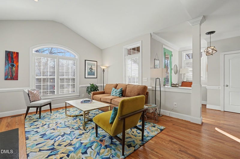 Listing details for 1213 Blount St, Raleigh, NC 27604 : Looking for the perfect place to begin your next chapter? This low-maintenance home offers the ease of first-floor living in a walkable location close to downtown Raleigh's favorite restaurants and local hangouts including Stanbury, Two Roosters, Crawford & Son and Yellow Dog Bakery! Move-in ready and filled with natural light, the open-concept main level features vaulted ceiling in family room, built-in storage beside FP, plantation shutters and hardwood floors throughout. The large kitchen was thoughtfully renovated in 2019 with soapstone countertops, tile backsplash, peninsula with cabinets on both sides, double pantry, newer stainless steel appliances and a functional bar/coffee station with beverage cooler. The main-level primary suite includes a walk-in closet, updated light/ceiling fan, and a beautifully renovated primary bath with leathered marble dual sink vanity, WC and a tiled zero-entry walk-in shower with built-in bench. Start your mornings with coffee in the charming side porch/sunroom, which opens to a fenced, maintenance-free side yard, perfect for your pet. The laundry is also located on the main floor and has built-in shelves and cabinetry. A back stairway leads up to a private bonus room with its own full bath that offers flexibility to use as a fourth bedroom, while an additional flex space is ideal for a home office, gym, or creative studio. Two more bedrooms share a convenient adjoining bathroom, providing plenty of room for guests or family. A rear-entry two-car garage opens to the community alley for easy access, and fully transferable solar panels make this home exceptionally energy-efficient with low electric bills. See list of extensive updates in mls.