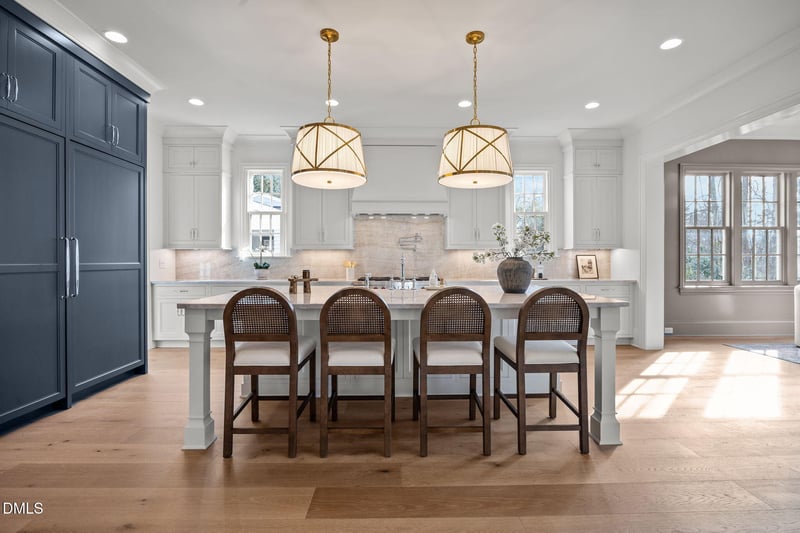 Custom millwork, carefully selected Visual Comfort lighting, and natural light working in harmony create spaces that feel both elevated and comfortable. The main living areas flow naturally, making the home as functional as it is beautiful, with refined tile selections and finishes that feel curated rather than trendy. The kitchen is designed for real use with Wolf and Subzero appliances, supported by a fully equipped scullery that keeps prep, storage, and hosting effortless while allowing the main space to remain open and composed.