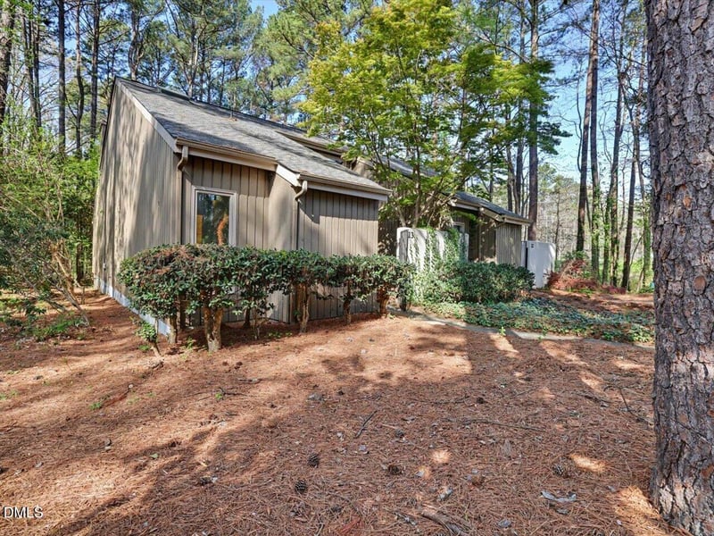 Listing details for 13 Vauxhall Pl, Chapel Hill, NC 27517 : Renovated end-unit townhouse in sweet spot of Chapel Hill. So close to everything and with lower Durham county taxes! Half mile to restaurants, Starbucks, and I-40. 10 min. to UNC, hospital, and downtown Chapel Hill, 15 min. to Duke, 15 min. to RDU airport. Great floorplan with first floor BR and tons of storage. Brand new March 2026 carpet, kitchen flooring and interior paint. Many 2021 updates, including kitchen and both bathrooms, tiled shower, basin sinks, LVP flooring, SS appliances, upgraded electrical, lighting and more. Bright main living space with skylights and gas fireplace. First floor laundry room, W/D convey. 2 sets of sliding doors open to large back deck with storage closet, overlooking wooded area. HOA just replaced most of deck and deck stairs. 2 BR with ensuite baths, one on each floor. First floor BR could be great office or guest room, with sliding door that opens to the front courtyard. Upstairs is huge primary with vaulted ceiling, large walk-in closet, updated BA with new tiled shower, and walk-in attic storage. Private fenced front courtyard. Walk to the Falconbridge lake, clubhouse, pool, tennis/pickleball courts. Roof 2022.