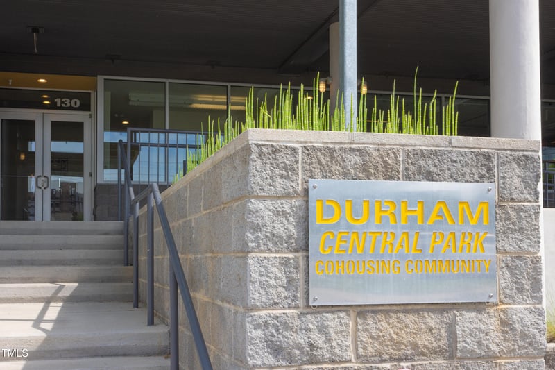 Listing details for 130 Hunt St #107, Durham, NC 27701 : For more information about Durham Central Park Cohousing Community (DCPCC) please visit https://www.durhamcoho.com/. This unique first-floor corner unit features 2 bedrooms, an office, large chef's kitchen, open floor plan, and ample closet storage. large windows provide a stunning view of a lush garden. Centrally located and within walking distance to Durham Central Park, The Durham Farmer's Market, Durham Food hall, downtown Durham shops and restaurants, near hwy 147 & 85, American Tobacco Trail, and more. The HOA fee includes the water, electric, internet, and cable! Highlights include a commercial grade kitchen, gathering spaces, laundry room, game room, two guest suites for visitors, a rooftop terrace on the 4th floor, a media room, and a community garden/courtyard. Additional features include solar panels, one garage space, and extra storage.