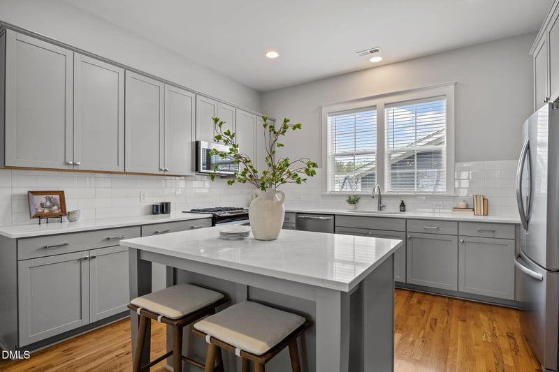 Built in 2018, the home welcomes you with site-finished white oak hardwood floors, soaring 10-foot ceilings, and open sightlines that create a light-filled, connected main living space. The kitchen is both refined and functional, featuring quartz countertops, a gas range, stainless steel appliances, soft-close cabinetry, and a spacious island ideal for gathering.
