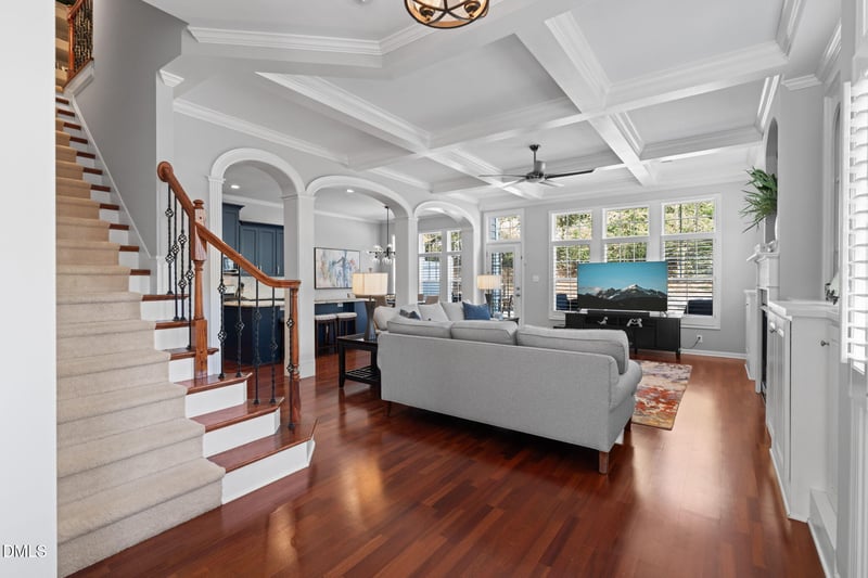 Listing details for 13227 Ashford Park Dr, Raleigh, NC 27613 : Rare, gated luxury townhome opportunity. One of the larger units with over 2500 sf. Main floor features warm cherry floors throughout, dining room/office/study, central family room with deep coffered custom ceiling, heavy moldings, and gracious archways separating the completely new kitchen (cabinets, granite, S/S appliances, backsplash, etc.) and informal dining area that overlooks double sized custom stone patio with outdoor dining area, as well as elevated fire pit and stone seating. Second floor offers hallway built-ins, a magnificent primary suite on the rear of the home that has a true sitting area, as well as an oversized primary bath with double vanities, soaking tub, and separate shower. The two secondary bedrooms are on the front of the second floor, and lead to the walk up unfinished third floor offering abundant daylight storage. There's so much to see here, you must visit this one.