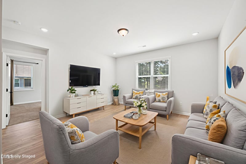 Inside, the layout is built for how people actually live. The main living area opens directly into a kitchen designed with quartz countertops, a large working island, modern cabinetry with crown molding, tile backsplash and a full lighting package that includes pendant and under-cabinet puck lighting. ENERGY STAR appliances and a gas range complete the space. LVP hardwood-look flooring carries through the main areas and blinds are already installed throughout the home.
