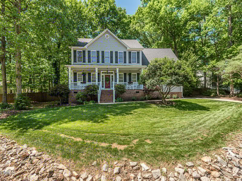 Listing details for 1332 Taylor Farm Rd, Raleigh, NC 27603 : Presenting a distinguished three-bedroom residence situated on a wooded lot with mature hardwood trees. Upon entry from the welcoming rocking chair front porch, guests are met with a grand foyer featuring hardwood flooring throughout the main level. The formal dining room offers a bright, inviting atmosphere--ideal for entertaining. The living room is enhanced by extensive windows that provide scenic views of the surrounding trees and blue sky, complemented by a custom fireplace and built-in shelves. Adjacent to the living area is a private office space equipped with a custom window, built-in desk, and cabinetry. The modern kitchen features quartz countertops, a stylish backsplash, premium café appliances, abundant cabinetry, and a walk-in pantry. The breakfast area overlooks the serene, wooded backyard, providing a peaceful start to the day. The primary bedroom includes a recently remodeled bathroom with double vanity sinks, a walk-in shower, and a separate water closet. A spacious walk-in closet features a custom organizer maximizing storage efficiency. Ascending the hardwood stairs to the second floor, a balcony overlooks both the living room and backyard. Two additional bedrooms offer ample space, and the completely renovated second full bathroom serves this level. The oversized bonus room is suitable for use as a game or theatre room, ideal for hosting gatherings. Generous walkout storage is available. The upper level is finished with high-quality laminate flooring. The expansive screened back porch offers privacy and tranquility, overlooking a backyard frequented by local wildlife. The fully fenced yard includes a custom-designed brick patio, enhancing outdoor living opportunities.