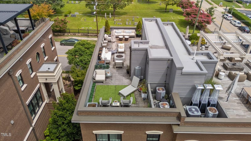 Listing details for 138 East St, Raleigh, NC 27601 : Elegant 3-Story Brownstone End Unit, with Rooftop Terrace and Raleigh Skyline Views! Built in 2017 by renowned Greg Paul Builders, this 3-story, 3 bedroom plus rooftop, brownstone offers a blend of classic architecture and modern finishes in a convenient location near downtown Raleigh. The main living level features an open layout with hardwood floors, smooth ceilings, and large windows that provide abundant natural light. The living area includes a gas fireplace and flows into a kitchen equipped with Viking appliances, including a counter-depth refrigerator, beverage cooler, and gas range. A deck just off the kitchen provides additional outdoor space and skyline views. The property includes multiple outdoor living areas, highlighted by a rooftop terrace of approximately 800 square feet with views of the Raleigh skyline. This outdoor space is tranquility in the city, above it all! Views for days, a firepit, water, tv for the games, it has it all! The home offers 3 bedrooms, 3 full bathrooms, and 1 half bathroom. Bathrooms feature tile finishes, and the home includes a mix of functional and upgraded design elements throughout. Additional features include built-in wiring for networking, a security system, and a private parking pad for one vehicle, with garage space and added storage! Located on a residential street with convenient access to downtown Raleigh, dining, shopping, and major roadways. Property Features: 3 Bedrooms 3 Full Bathrooms, 1 Half Bathroom Approx. 800 SF Rooftop Terrace Built in 2017 by Greg Paul Builders Viking Appliances with Gas Range Hardwood Floors Gas Fireplace Deck, Courtyard, and Balconies Wired for Networking and Security System Private Garage Private Parking Pad