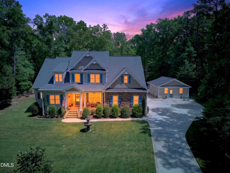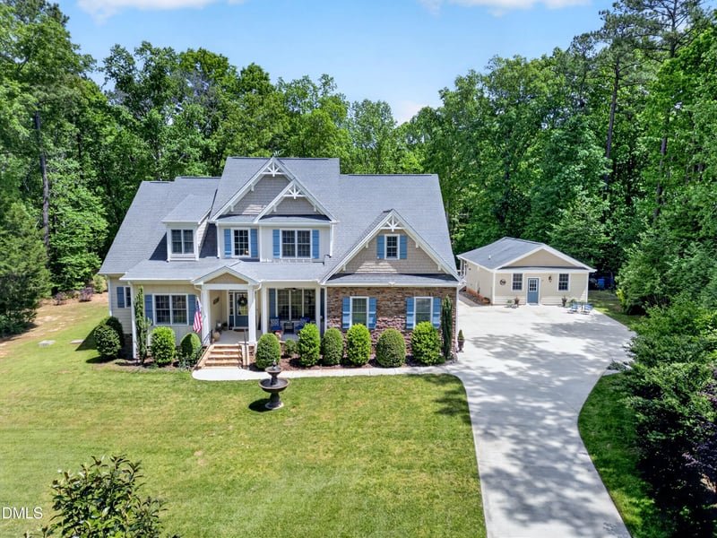Listing details for 139 Henrys Watch Ln, Pittsboro, NC 27312 : Gorgeous Henry's Ridge home on a private 2-acre wooded cul-de-sac lot offering exceptional privacy and resort-style living just minutes from beautiful Jordan Lake! This distinguished residence features an exceptional floorplan featuring 4BR/5BA plus office/flex room and dual primary suites (one on each level). Ideal for multi-generational living with a detached 1BR ADU complete with full kitchen, living and dining areas, laundry, and screened porch--perfect for extended family or guests. The main home showcases stone accents, covered front porch, large screened porch, Trex deck, and a resort-style backyard with inground saltwater pool, water features, patio, and covered pavilion, all surrounded by mature trees for privacy. Recently painted inside and out, the open floorplan features hardwood floors and crown molding throughout. Gourmet kitchen includes quartz countertops and backsplash, large island, stainless steel appliances, double ovens, 36'' gas cooktop, and pot filler. The family room offers a coffered ceiling, floor-to-ceiling stone fireplace, and built-ins. Additional highlights include no HOA, well water (no water bills), separate tankless water heaters for main home and ADU, whole-house water softener and filtration system plus reverse osmosis filter in kitchen, generator transfer switch, Cat-5 wiring, boat parking pad, and 10x20 storage building. Meticulously maintained, this exceptional property offers the perfect blend of luxury, privacy, and flexible living--just minutes from Jordan Lake.