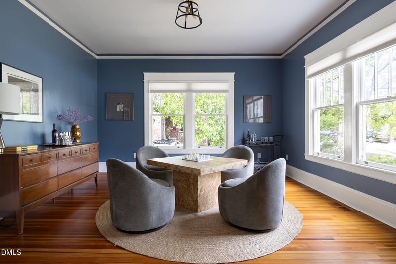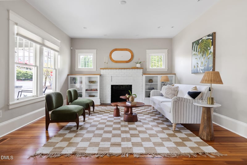 Listing details for 1401 Maryland Ave, Durham, NC 27705 : Stunning 1920s Craftsman, meticulously renovated and thoughtfully expanded in Watts-Hillandale, one of Durham's most coveted front-porch historic neighborhoods. Exceptional materials and details run throughout, including German lap board siding in excellent condition and a Galvalume roof and gutters. The renovation and addition were completed by one of Durham's premier builders as his private residence. Cathedral ceilings with exposed beams steal the show in the heart of the home. The eat-in kitchen has also served beautifully as a den, while quartz countertops, high-end appliances, and a reclaimed wood bar tie old and new together with ease. Pass a floor-to-ceiling feature wall of bookshelves to the spacious primary suite, with an en suite bath offering a zero-entry shower, double vanities, and a large walk-in closet thoughtfully designed with a convenient laundry pass-through. The flexible floor plan offers a front room ideal as a home office, formal dining room, or lounge. Heart pine floors run throughout the main living areas, including the spacious screened porch, while original 4-over-1 windows nod to the home's history. The walkout basement with stained concrete floors provides additional flexibility, with space for a fourth bedroom, playroom, or second office, plus a large den suited for a teen retreat, game room, or home theater. Outdoor living shines beneath a custom metal pergola with adjustable louvers, surrounded by low-maintenance native landscaping, a water garden, and thoughtfully designed drainage for peace of mind. A large framed historic photo of Watts-Hillandale, showing 1401 Maryland in its early days, conveys with the home.