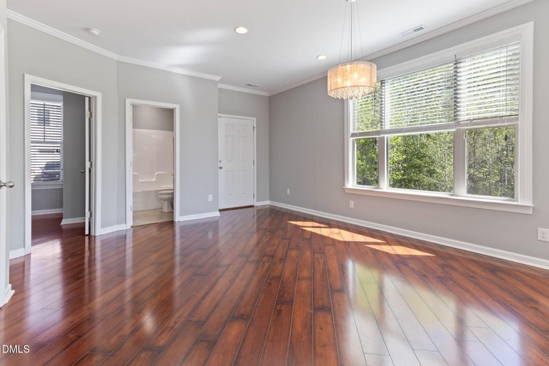 The home is well laid out and spacious, featuring a private office or bedroom on the main level and a large deck--perfect for anyone working remotely. Forget about yard work and spend your mornings or afternoons exploring the trails at Falls Lake, or unwind with the most beautiful sunsets from the oversized deck.