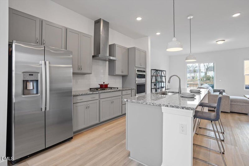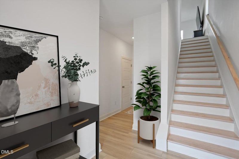 Listing details for 1434 Grove Village Rd, Wake Forest, NC 27587 : Positioned in a highly desirable Wake Forest community, this stunning end-unit rooftop townhome offers exceptional space, thoughtful upgrades, and versatility rarely found in townhome living. Featuring a two-car garage and a spacious multi-level design, the entry level welcomes you with a private guest suite complete with a full bath--ideal for visitors or multigenerational living--as well as a large coat closet just off the garage. The main living level showcases impressive 10-foot ceilings and durable LVP flooring throughout the entryway, staircase, and entire main floor. The open-concept layout is perfect for entertaining and truly lives like a single-family home. The gourmet kitchen is a showstopper, featuring quartz countertops, an oversized island with abundant cabinetry, and a custom upgraded pantry system. It flows seamlessly into the bright living area, complete with Yoolax automatic blinds, space for a 100-inch TV, and direct access to a private balcony. Upstairs, you'll find a convenient laundry closet with built-in shelving, spacious secondary bedrooms with generous closets--ideal for bedrooms or home office use--and a luxurious primary suite featuring custom closet shelving, fan prewire, and an additional Yoolax automatic blind system.