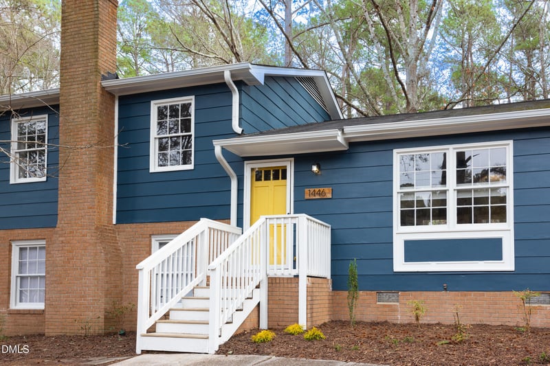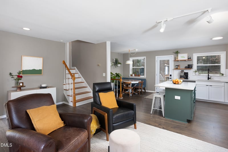 Listing details for 1446 Clermont Rd, Durham, NC 27713 : Perched on a hill in the established Parkwood neighborhood, this light-filled split-level blends 1970's character with thoughtful modern renovation. The fully opened main level was professionally redesigned to create seamless flow between kitchen, dining, and living spaces ideal for entertaining or everyday living. The renovated kitchen anchors the home with quartz counters, stainless appliances, gas range, generous island seating, and clean white cabinetry. Large windows throughout flood the home with natural light and frame peaceful wooded views.