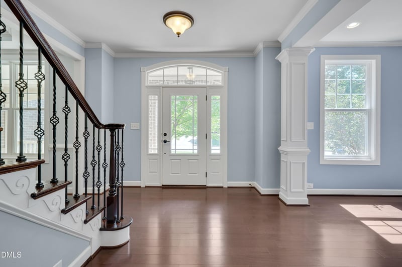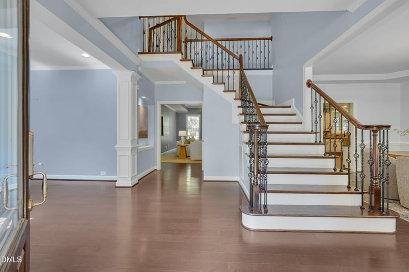 A grand entrance foyer with soaring ceilings and an open wooden staircase creates a striking first impression. From there, rich hardwood floors guide you into the heart of the home--a well-appointed gourmet kitchen featuring a large island, granite countertops, and stainless steel appliances. The space also includes a sunny breakfast nook and a walk-in pantry with custom wood shelving, all flowing seamlessly into the inviting family room with a cozy gas fireplace--perfect for everyday living and gathering. A formal dining room offers an elegant setting for entertaining, while the first-floor guest suite provides both comfort and privacy for visitors.