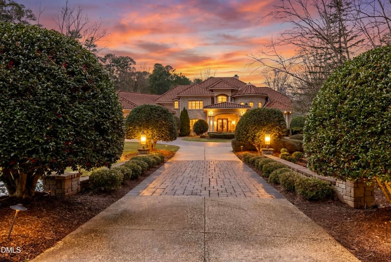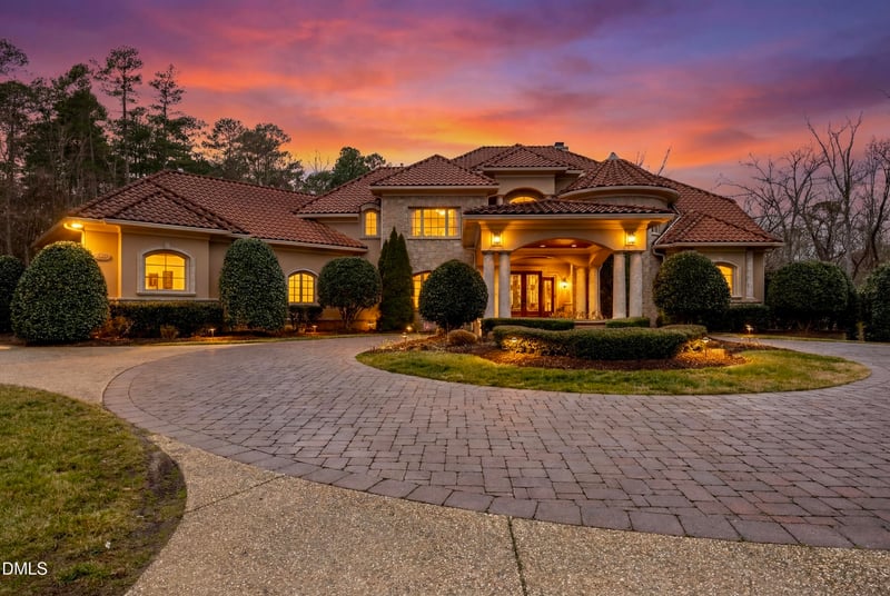 Listing details for 149 Perfect Moment Dr, Durham, NC 27713 : Behind the gates of ''The Hills of Rosemont'', one of the NC Triangle's most sought-after private & exclusive communities, lies a Mediterranean Tuscan Villa-style 5-bdrm estate built by Rex Bost that boasts nearly 9000 sqft of dynamic living space, with a timeless fusion of classic architecture & modern features, outdoor living with pool/spa oasis, sitting on over 4 acres of secluded & wooded land. As you can walk through the grand foyer you'll be greeted by the spiral riverwood stairs & the 2-story formal living room with soaring trey ceilings, wet bar, fireplace, and floor-to-ceilings windows offering panoramic views into the pool. Look to your left to find the formal dining area & elevator access to all 3 levels. Look to your right to find the office/den w/ built-ins & coffered ceilings, powder room, and main level primary suite w/ fireplace, wet bar, access to terrace, spa bath w/ jetted tub, steam shower, walk-in-closet, and coffee bar. Gourmet kitchen equipped with climate-controlled 800+ bottle wine cellar, double wall ovens, 6 burner range w/ griddle, 2 warming drawers & massive range hood. 48' thermador fridge, apron sink, 2 dishwashers, and oversized breakfast area with access to expansive terrace w/ fireplace. 2-story family/great room includes fireplace, vaulted beamed ceilings, custom aquarium & TV arm. Main level also includes the laundry room, 2nd powder room, and access to a 3-car garage w/ room to fit car-lifts. As you walk up those spiral steps, you'll find 3 generously-sized suites, bonus room w/ attic space, and loft area w/ juliet balcony overlooking the great/family room. One of the upstairs suites includes another loft area, with a juliet balcony overlooking the pool. Fully finished walk-out basement includes expansive living & recreation area w/ fireplace, kitchen, theater room, additional full suite, and a full pool bath. Additional storage/mech rooms with a concrete safe room. Fenced-in backyard includes an expansive patio area, outdoor grill, heated & cooled saltwater pool & hot spa, and tanning deck. This home also has an EV charger & central vac. Innumerable elegant touches throughout the property; arched doorways, intricate molding, light fixtures & chandeliers, concrete barrel tile roof, 5 fireplaces, stained glass dome above spiral steps, and so much more. Located across the street from the prestigious Old Chatham Golf Club, backing the American Tobacco Trail. This property feels very rural & secluded, though it is right in the middle of Chapel Hill, Southpoint Durham, Cary, Apex, Morrisville, RTP, RDU. This is a home like no other, come see it today.
