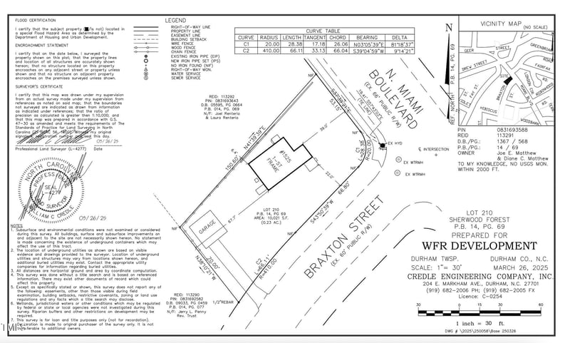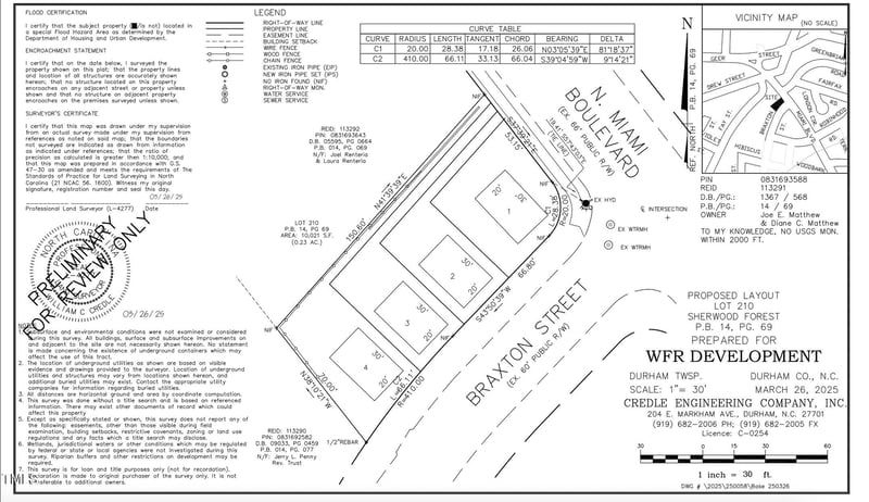 Listing details for 1525 Miami Blvd, Durham, NC 27701 : 4 lots at 1525 N Miami at $75,000 per lot. Lots can be bought individually. These lots can also be part of 4 lots at 2511 E Main and 3 lots at 1701 Robinhood. Lots will be delivered with the homes removed/demolished, the lots subdivided and the land roughly graded prior to close. Do not disturb or enter the current home