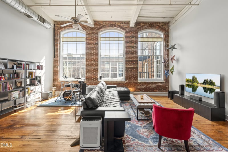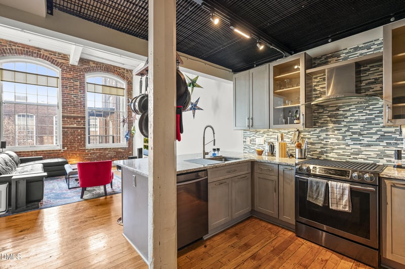Listing details for 1535 Caraleigh Mills Ct #218, Raleigh, NC 27603 : Industrial edge meets modern cool in this two-bedroom residence set inside one of Raleigh's most iconic fully restored mills. Soaring vaulted ceilings, raw original floors, and oversized historic windows flood the space with natural light, celebrating the building's past while delivering the modern style today's lifestyle demands. The open-concept layout flows effortlessly from kitchen to dining to living--ideal for relaxed everyday living or hosting friends. Striking modern staircase leads to a lofted office space, perfectly tucked away for work, study, or creative pursuits. One of the home's most distinctive features? A clever hidden door leading to the primary suite, adding a playful architectural surprise and a sense of private retreat. Inside, the primary bedroom showcases exposed beams, historic character, and soft natural light filtering through transom windows. A spacious second bedroom on the main level offers flexibility for guests, hobbies, or additional workspace. Original wood floors anchor the home in authentic mill character, while updated baths and a generous laundry area bring everyday convenience. A deeded storage unit conveys with the condo--an added bonus rarely found in urban loft living. Beyond your front door, the community delivers true lifestyle amenities: a state-of-the-art fitness center, resort-style pool with cabana, community garden, and dog park, all within a secure gated setting. Stylish, distinctive, and effortlessly livable, this is urban living at its best in the heart of Raleigh--and with rentals allowed, it's also a compelling opportunity for investors.