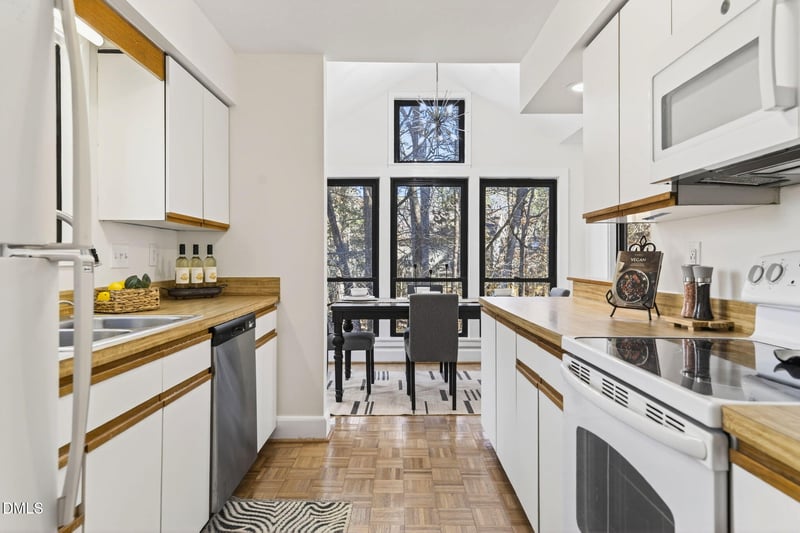 Listing details for 16 Stillwater Pk, Durham, NC 27707 : The moment you open the door, you'll know this home is something special! This fresh and spunky 2-bedroom, 2-bath condo has been thoughtfully updated with new LVP flooring, fresh paint, smooth ceilings (no popcorn!), and stylish new lighting throughout. Natural light pours into every room! The living space features a real wood-burning fireplace with a charming brick surround and built-ins, creating a cozy focal point. A sunny dining nook feels just right for morning coffee or relaxed dinners. Both oversized bedrooms are true ensuites with generous closets!Step onto the covered balcony to enjoy peaceful, wooded views and the simple pleasure of listening to the birds chirp, plus the convenience of an outdoor storage room. Washer, dryer, and refrigerator are all included. Just steps from the community pool and perfectly positioned to walk to Harris Teeter, Fresh Market, Target, restaurants, shops, and more—this home is also on the Durham GoRoute and an easy bike ride to Duke University.