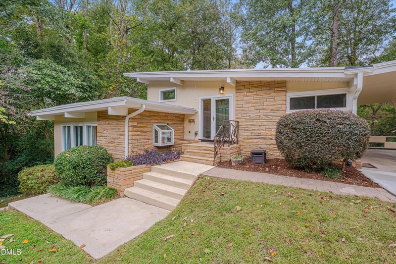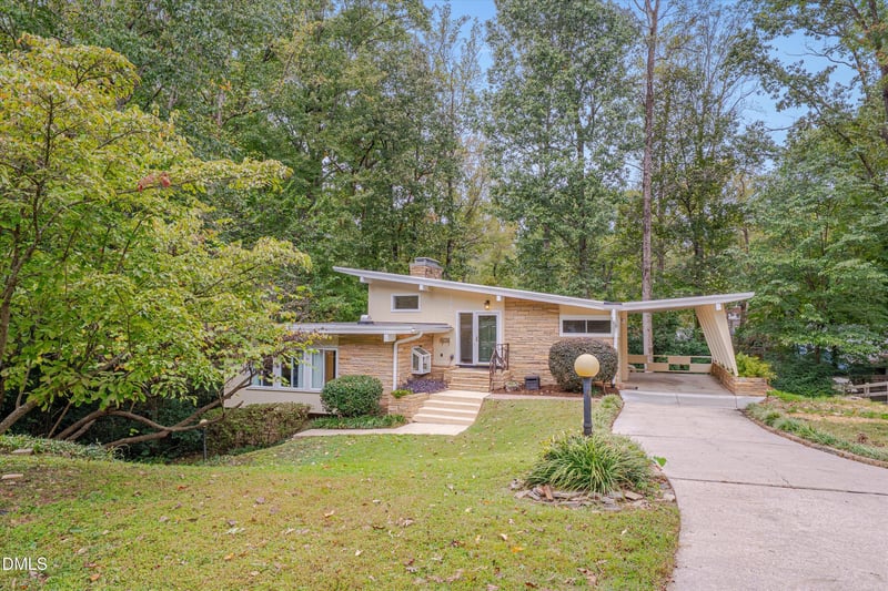 Listing details for 1617 Shawnee St, Durham, NC 27701 : PRICE IMPROVEMENT! Have you ever wanted to live in a Butterfly House (yes, you are looking at a butterfly roof!) - Your opportunity awaits! 1617 Shawnee is a dreamy, Mid-Century Modern, California-cool abode whose full potential has yet to be realized. This iconic home was created by Durham native, TW Wilkinson in 1957 and has been a show stopper ever since. Own a piece of Durham history (https://www.opendurham.org/buildings/1617-shawnee-street-alfred-henderson-king-house). A nice driveway leading you to the tall carport welcomes you home. Built-in, stone planter boxes are overflowing with beautiful flora. A gorgeous, custom-made metal handrail adorns the front steps - a special thank you to local artist, Andrew Preiss for this one-of-a-kind piece of art! Contemporary shapes and a variety of textures create allure before you even walk in the door. To prepare this home for the market we have given it fresh paint, inside and out. You'll open the deep green, solid wood front door and arrive on original parquet flooring overlooking the three secondary bedrooms and their bathroom on this, the top floor. To your left is a modest set of stairs guiding you to your main living level with solid floors and massive windows - natural light and nature views flood in. Your dining room is sizable and your family room is large. An attractive fireplace takes the stage and a recently painted upper deck gives you the outdoor space you need to grill and entertain. The kitchen has just been refreshed with quartz counters, revived cabinetry, and new stainless steel appliances. You'll notice the warm light streaming in from every direction. Our next floor offers a landing, the main suite, and the laundry/utility room with brand new water heater and a 1/2 bathroom. The main suite in huge! Two satisfactory closets and an improved en suite make this space feel fresh and private. You can exit this floor and pop outside through an unassuming addition and land on the lower deck. The basement floor offers a cozy, hip vibe. A checkerboard linoleum paints the floor where you have your den, second fireplace, large entertaining bar, and potential for a second kitchen-like entertaining space. The same enormous windows make you feel like you are at one with the environment. A tall, black storage unit conveys so that you can house your family games the moment you move in. This floor gives another access to the exterior and the paths that frame this special property. Outside is private and serene. A lovely walkway takes you from the front of your home to the wooded lot that conveys with this one (1609 Shawnee)! Your stroll takes you next to a sweet stream and over a bridge to a secret hideaway! The back yard is lush with established greenery and mature trees. The location is excellent! You are in the quieter section of the coveted Duke Park neighborhood with the larger lots! Across the street is a neighborhood owned 2-3 acre preserve where you can meander among the trees. The Duke Park trails and playground is just a short 8-10 minute stroll away! There is more potential, character, and charm at 1617 Shawnee Street than at any home you have seen in a while. Come, let your imagination run wild and tour this truly fantastic property today!
