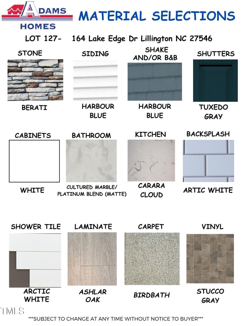 Listing details for 164 Lake Edge Dr, Lillington, NC 27546 : Discover the impressive 3040 floor plan offering 5 bedrooms, 3.5 baths, and a spacious bonus room on a large lot backing up to the woods and a small pond. The main level features the primary suite plus 4 additional bedrooms, a bright family room with fireplace, and kitchen with quartz countertops, oversized island, walk-in pantry, and upgraded stainless appliances. The dining room includes tray ceilings and board-and-batten accents, while the primary suite boasts a walk-in closet and spa-style bath with dual vanities, soaking tub, and tiled shower. Upstairs offers 1 bedroom, a full bath, and a large bonus room. Notable features include a patio, laundry room, finished 2-car garage, and stone-accented exterior. This home is under construction and all pictures and features are representative of the actual home being built.