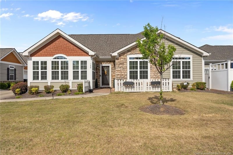 Listing details for 166 Nandina Ct, Fayetteville, NC 28311 : Welcome to 166 Nandina Court, a beautifully designed and spacious low-maintenance cottage style home with a thoughtfully designed layout. The well laid out floor plan features vaulted ceilings in both main living areas and the primary suite, complemented by numerous windows, and ceiling fans for a spacious feeling. The home includes three bedrooms and three bathrooms, a formal dining room, flexible space for that home office with double doors, and a spacious living room with a gas fireplace. Luxury flooring extends throughout the home, with carpeting limited to the bedrooms and tiled in the bathrooms/laundry area.Featuring staggered cabinets, granite countertops, a tiled subway backsplash, recessed lighting, and a spacious pantry, the kitchen is beautifully designed. It also offers a breakfast bar and comes equipped with all stainless-steel appliances. The sought-after split floor plan includes a primary suite with a private bathroom featuring a double vanity, a fully tiled shower, and a large walk-in closet. The secondary bedroom is well-sized and conveniently located next to a full bathroom. Upstairs, you'll find a large third bedroom with its own full bath and walk-in closet—ideal for accommodating guests. The laundry room is fitted with a wet sink and extra storage space. Stylish finishes are showcased throughout this remarkable home, making it a must-see! The side-entry double garage provides plenty of parking, and the front-fenced patio is perfect for unwinding at any time of day.Stroll along the walking trail or relax in the clubhouse equipped with a full kitchen, pool table, and TV area. Make use of the gym or cool off in the swimming pool! This vibrant community has so much to offer! The property is in a prime location, just minutes from Methodist University, Goodyear, Ft. Bragg, I-295, as well as a variety of restaurants and shopping options.