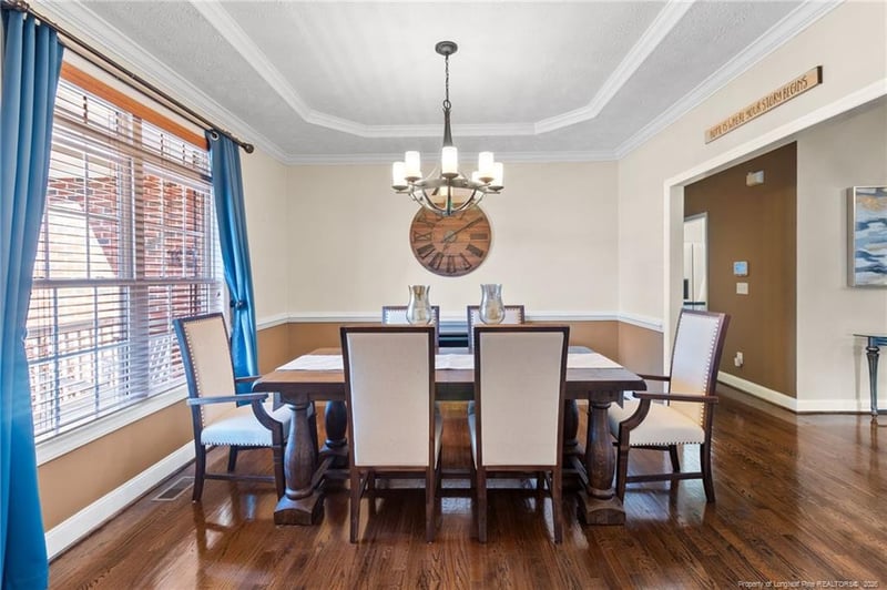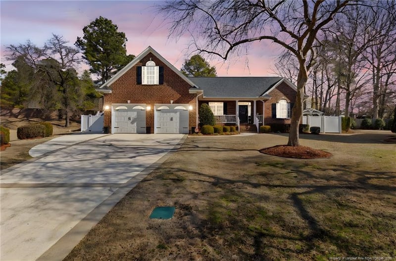 Listing details for 1705 Telluride Ct, Fayetteville, NC 28304 : Beautiful and spacious brick ranch in a gated community, featuring 5 bedrooms, 3 full and 2 half baths, and a stunning backyard retreat. With over 3,200 square feet, this home offers a resort-style pool, pergola, multiple seating areas, and upgraded outdoor spaces designed for entertaining. A rare combination of privacy, space, and luxury in a quiet cul-de-sac setting.A covered front porch provides space for seating and welcomes you inside. The entry is flanked by a formal dining room on the left and a private office on the right, complete with French doors for added privacy. The main living area features a fireplace and modern chandelier and opens seamlessly to the eat-in nook and kitchen, creating an ideal layout for both everyday living and gatherings.The kitchen is finished with white cabinetry, black hardware, black granite countertops, a tile backsplash, and stainless steel appliances. Just off the living room, a sunroom with five windows, custom upper windows, and a fireplace offers abundant natural light and overlooks the backyard.The primary suite is generously sized and includes a sitting area, dual vanities with modern counters, a tiled shower, and two closets. Additional bedrooms are well-sized, including one with a private full bath offering the option for a second primary suite. A fifth bedroom is located upstairs over the garage with its own private half bath, ideal for a guest suite, media room, or in-law space.The backyard is thoughtfully designed with a resort-style pool, pergola, multiple seating areas, garden beds, and a fully fenced yard—creating a private outdoor living space ideal for entertaining or relaxing. Additional highlights include a two-car garage with epoxy flooring and a large driveway. Conveniently located minutes to grocery stores, dining and shopping, with an easy commute to Fort Bragg.