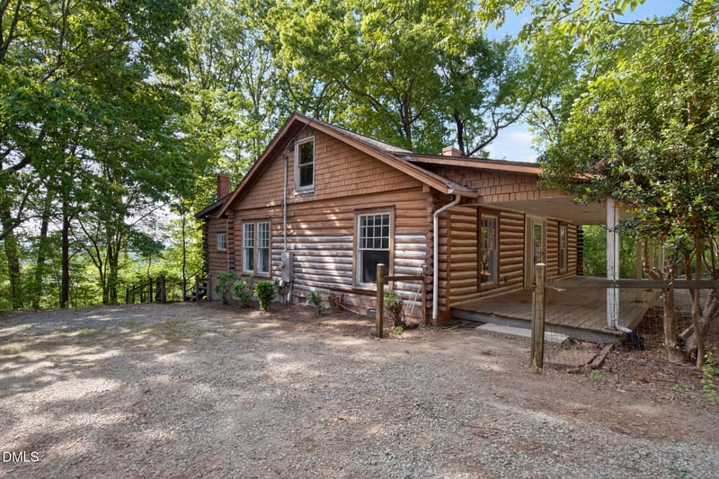 Listing details for 1714 Terry Rd, Durham, NC 27712 : 1714 Terry Rd feels like a hidden mountain retreat, yet it's right in the heart of Durham. As new construction fades behind you, the road climbs to the top of the hill where this rustic log cabin sits, offering elevated views for miles and a sense of total escape. This 3-bedroom, 1-bath home is brimming with character and ready for its next chapter. Inside, you'll find original hardwood floors just waiting to be refinished, a cozy family room with fireplace, and a kitchen with adjoining dining area that's full of potential. The layout is simple, functional, and primed for a thoughtful renovation. Step outside to the full-width front porch, the perfect place to take in the sweeping views and quiet surroundings. A rear deck (in need of repair) adds even more opportunity to expand the outdoor living space. The location offers the best of both worlds; convenient to everything Durham has to offer, yet peaceful, private, and feeling worlds away. A dream cabin home with a setting that's hard to replicate, bring your vision and unlock the potential of this one-of-a-kind hillside retreat.